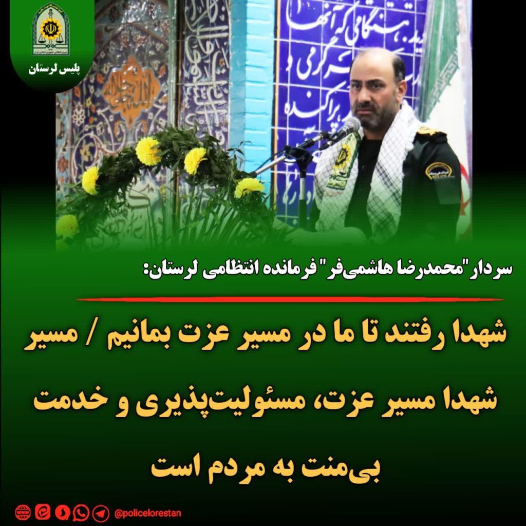 فرمانده انتظامی لرستان در دومین یادواره ۳۵ شهید انتظامی شهرستان سلسله با بیان اینکه شهدا رفتند تا ما در مسیر عزت بمانیم تصریح کرد: شهدا مرزبانان نور و پیام‌آوران عزت‌اند؛ کسانی که با معامله جان خود با خداوند، مسیر عزت، ایمان، آگاهی و بصیرت را برای جامعه ترسیم کردند